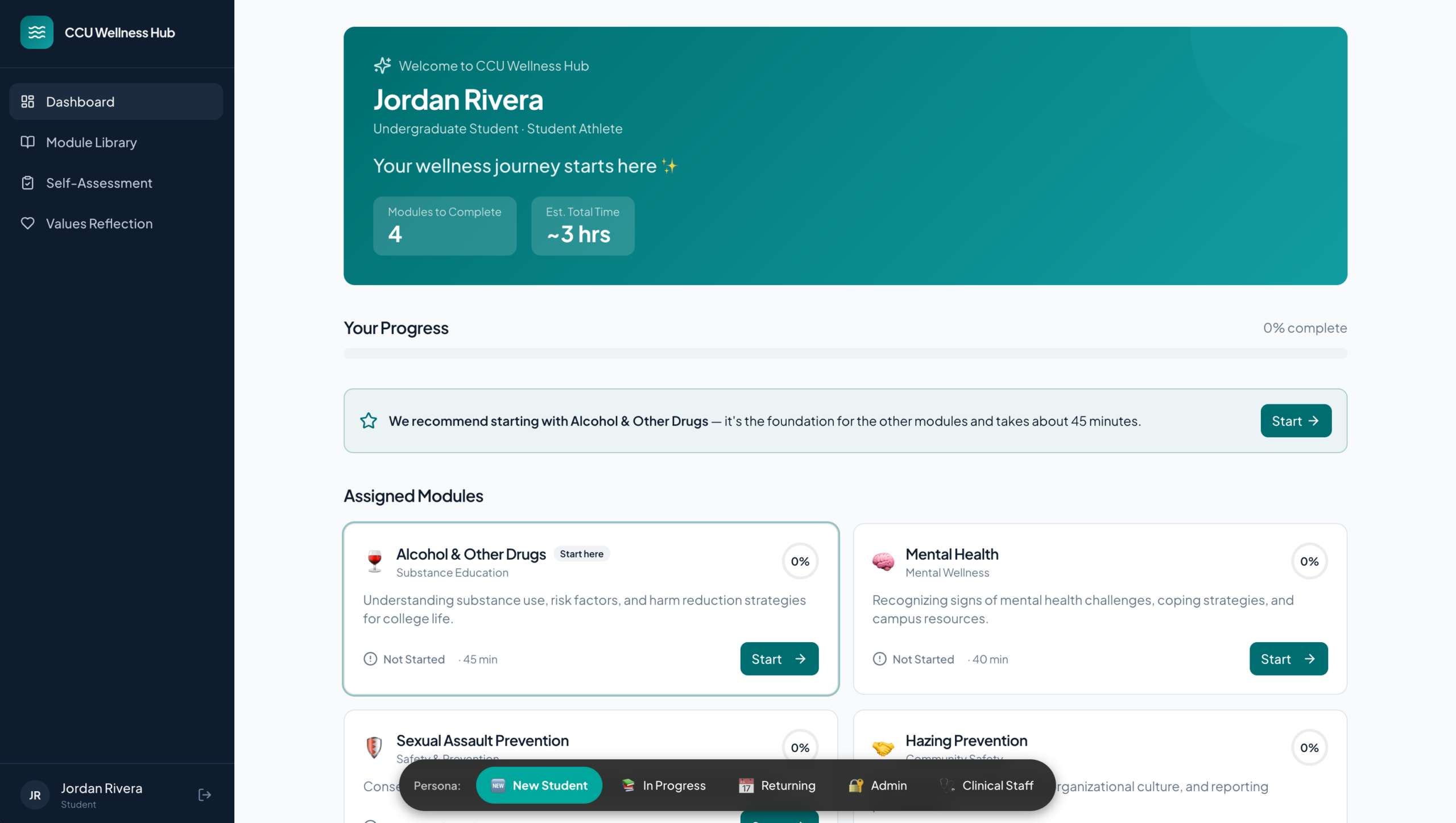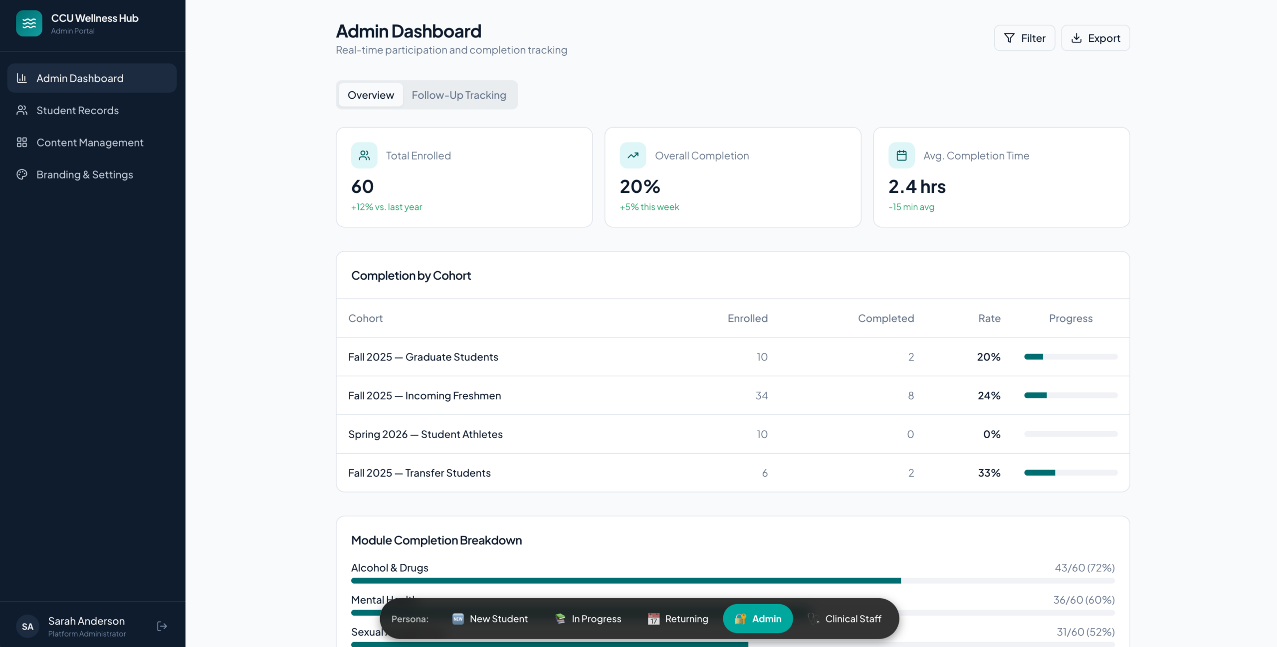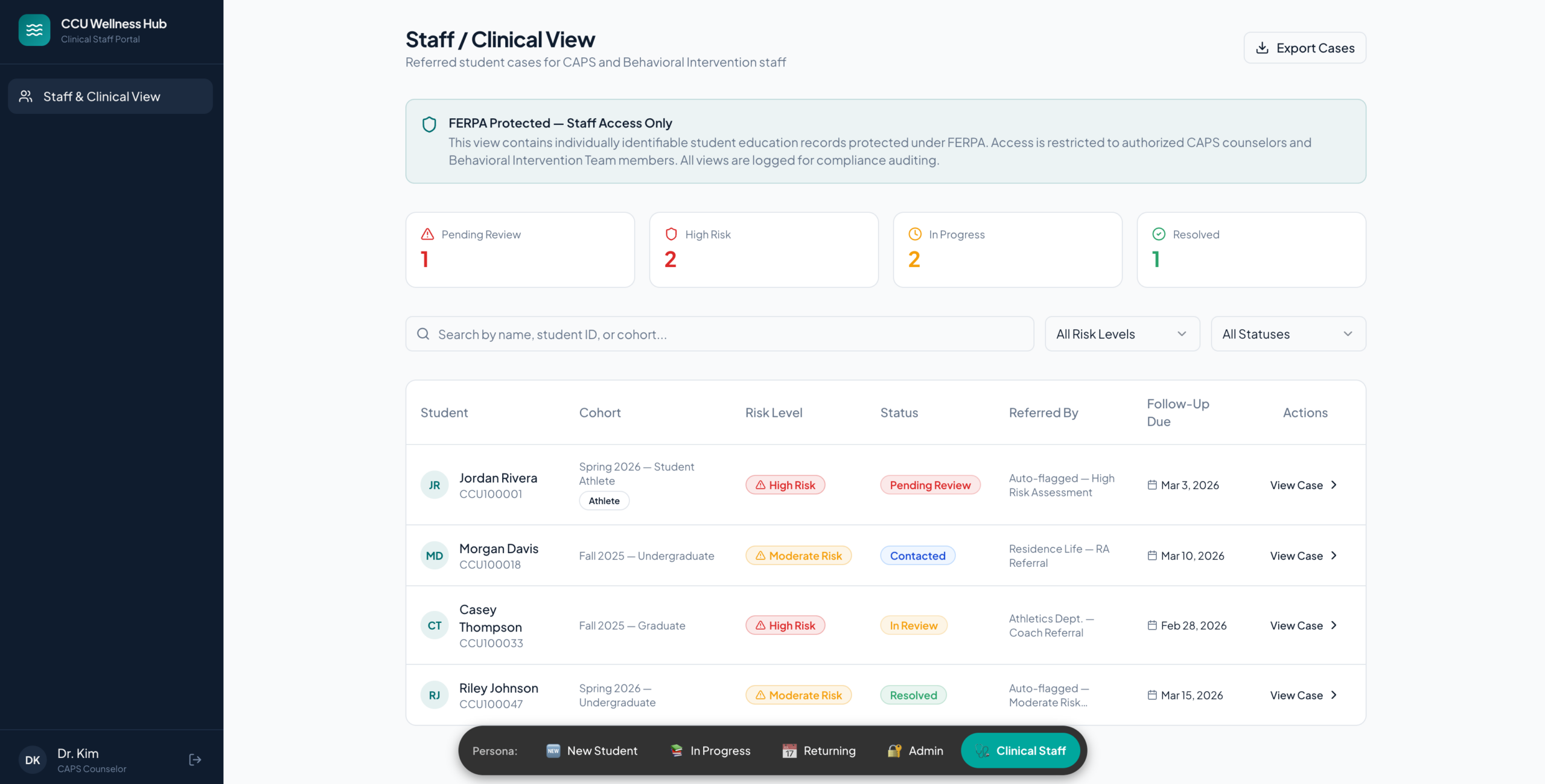 It is accessible at ccu-wellness.web.app and available for demonstration to institutional clients and procurement officers evaluating our capability for behavioral health, higher education, or compliance-adjacent platform work.